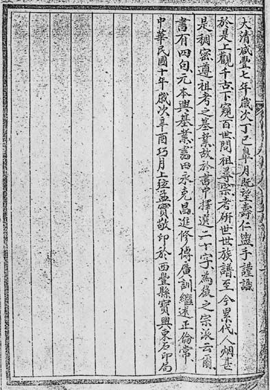 于是上观千古,下窥百世,问祖寻宗,考研世世族谱,至今累代,人烟甚是稠密,遵祖考之基业,故于书中择选二十字,为后之宗派云尔。书有四句:元本兴基业,书田永克昌。进修传广训,继述正伦常。