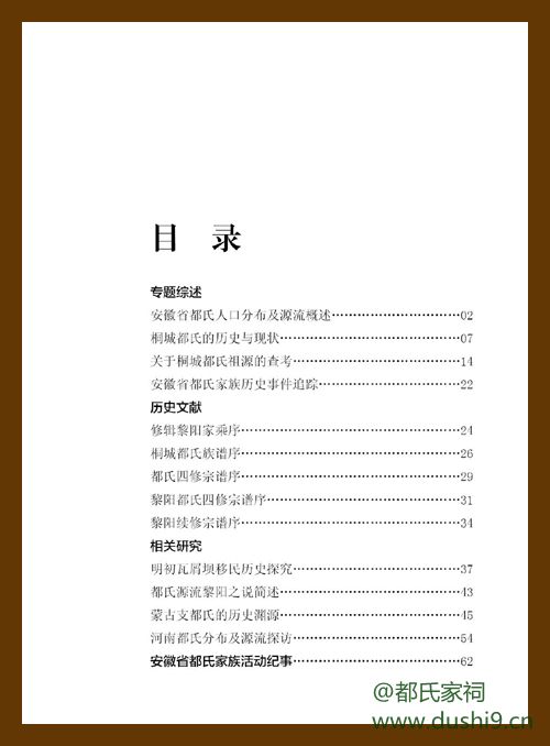 为组织召开安徽省都氏家族联谊会成立大会,自今年元月开始,安徽桐城都旭杰大哥组织开展了安徽省都氏资料的挖掘和整理工作,并亲自驾车到江西、河南等地进行实地探访,收集相关资料。日前,《安徽省都氏资料汇编》已由都氏文化研究工作室编印成册,共分专题综述、历史文献、相关研究、安徽省都氏家族历史事件追踪和安徽省都氏家族活动大事记等。将在安徽省都氏家族联谊会成立大会上赠送给大家。