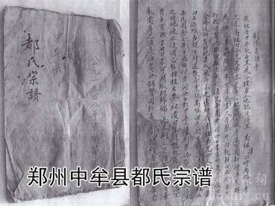 (三)郑州市都氏源流考证。郑州都姓人口不是很多,而且比较分散。已知的目前只有中牟县,原始分布集中在中牟城北耿石里(今万滩镇耿石屯),目前万滩、油房头、东漳、关家、王庄、闹市口村、王林庄、辛庄、曹宋等村都有都姓人散居。这支都姓人保存了民国三十七年编修的《都氏族谱》。2010年8月当地族人对族谱进行了续修。新修家谱共有3篇序言:2010年8月,续修人都保安《续修宗谱序》;民国三十七年编修人都际唐《创修宗谱序》;民国三十七年编修人都际泰《创立宗谱序》。郑州市中牟县都氏宗族,长期居住中牟城北耿石里,以农业为主,“凿井而饮,耕田而食”,风俗淳朴,耕读传家。自始祖有记载开始距今延续约200多年,繁衍十代。清朝道光末年,黄河决口之后,各门散居在万滩、油房头、东漳、关家、王庄、闹市口村、王林庄、辛庄、曹宋等村。一世祖为兄弟二人(或云系胞兄弟,或云系堂兄弟),因年代久远,名字及生卒年月不详。但记载,其中一人育有四子,长子都文雅,次子名字不详,三子都甲森,四子都文化。另一人育有都恒昌、都合昌、都世昌等。东漳村的记载比较详细, 其中提到,二代都甲森生于清朝嘉庆十二年,三代都丙炎生于清朝咸丰五年,四代都嵩峰生于清朝同治九年,五代都际泰生于清光绪十七年,都际唐生于清朝光绪二十六年,六代都保舜生于清朝宣统二年,都保治生于民国四年,都保民生于民国十年,都保玉生于民国十七年,都保安生于民国二十一年,都保华生于民国二十三年等。关于中牟县都氏的祖源,民国二十七年都际泰《创立宗谱序》中提到:“溯吾族之由来,据先祖之传言,考旁文之记载,知吾族於洪武定鼎之初,远自洪洞迁来。”2010年都保安《续修宗谱序》中介绍:“得姓世祖”古代春秋时期,郑公孙阙,字子都,其后以父字为姓,相传姓都。“祖居堂号”,后魏置黎阳郡,现在河南省浚县县城以东2公里。