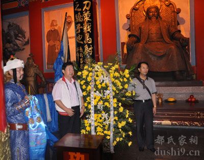29日上午,与会代表来到兴安盟罕山之巅的成吉思汗庙,隆重举办了祭拜成吉思汗大典及都本基先生为成吉思汗庙书写楹联揭幕仪式。内蒙古兴安盟宣传部李部长和国家博物馆副馆长都海江分别拉开了元太祖成吉思汗铜像两旁柱子上的红色帷幕,都本基先生挥毫书写的镀金楹联气势恢宏地展现在人们面前:“统草原征亚欧主神州惟亘古一帝乎,挥弯刀策战马射大雕乃天之骄子也。”都氏宗亲祭拜成吉思汗大典由当地蒙古族人额尔敦与宗亲代表都媛主持,大连司法局局长都本有和正军职干部都基焱代表都氏宗亲敬献花篮,花篮飘带上写着“中华人民共和国大陆地区都氏宗亲敬献”。4位年轻美丽的都姓姑娘手托盛满各种贡品的4个大盘供奉在元太祖坐像前,参加祭拜的十三个省、市、自治区的都氏宗亲代表向圣祖成吉思汗敬献哈达,参加祭拜的所有都氏宗亲依次叩拜。祭拜大典结束后,各位都氏宗亲在讲解员的带领下参观了成吉思汗庙的各展厅。之后又参观了内蒙古民族解放纪念馆。