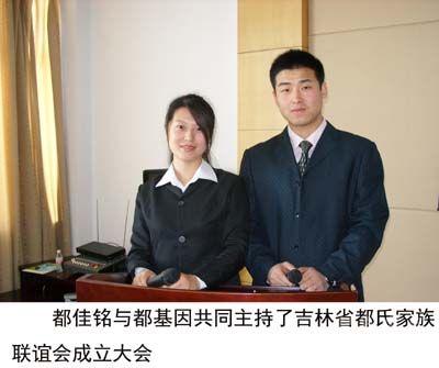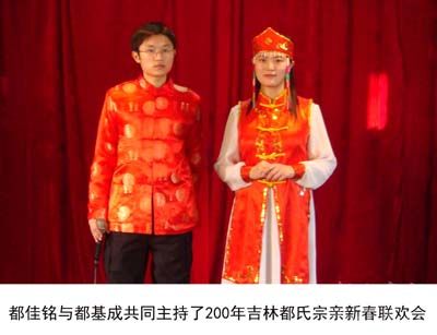 09年元旦,吉林省首届都氏宗亲新年联欢会在美丽的江城吉林市召开,参加此次联欢会的吉林省都氏宗亲达到80多人。很荣幸,我担负了这次联欢会的主持任务,这对身为都氏子孙的我是莫大的荣耀。从此,我也参与到家族事务中来,并积极为家族事业做出着自己的努力。