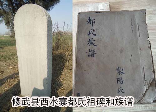 在西水寨村委会办公室,我们看到了当地都氏族谱《黎阳氏都氏族谱》。通过族谱序言,我们了解到:修武县都氏族谱创修于民国二十二年,建国后的1957年进行了续修,此后又两次修谱,将修武县都氏家族的世系整理的比较清晰。在村委会主任都文以及都永昌、都豫良的陪同下,我们来到西水寨村都氏祖茔,实地查看了一块古老的都氏先祖碑。先祖碑虽然历尽沧桑字迹有些模糊,但是我们辨认出立碑的时间“大清乾隆四十二年”,碑文记载当地都氏于明代洪武年间来自山西陵川。