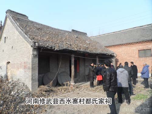 西水寨村都氏族人对我们的到来表示出极大的热情,敲锣鼓,放鞭炮,村委会主任都文亲自带领我们叩拜都氏家祠。据都文介绍:西水寨村总人口2600多人,其中都姓人占90%。邻村东水寨村总人口3000多人,其中都姓人口占70%。周边朱营村、东板长村、西板长村、冯营村、不庄村也有许多都姓人居住。这里是修武县都氏祖居地。西水寨村都氏家祠修建于1953年4月,每逢大年初一,当地都氏族人要来到这里祭拜先祖。