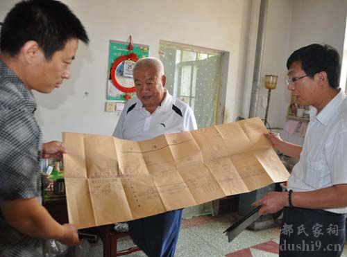 都东生先生祖籍河北省衡水市,目前在吉林省经营长春润都彩钢钢构有限公司。通过都东生先生的联络和指引,我们首先来到衡水市阜城县城拜访了居住在这里的阜城县人民法院原院长都学功先生。都学功先生现已年近七十,对都氏家族事务十分关心,自己保留了父亲从民国十六年到建国后1972年共计45年的日记,退休后经过多年查访亲自绘制了本支家族世系谱图。据都学功先生介绍,他们这支都姓人原始居住村落主要集中在衡水市阜城县大白乡东都村、西都村,沧州市泊头市四营乡都家泊洛村,虽然属于两个地级市,但是相距只有20公里左右。这里没有族谱之类的历史资料,也没有规范统一的辈份排列用字,因此这支都姓人是什么年代、从哪里迁徙而来均无所知。但是从祖坟的地点可以推测,是先有都家泊洛村,后有东都、西都,也就是说东都、西都的都姓人是从都家泊落村搬来的。通过都学功先生亲自绘制的本支家族世系谱图,我们看到这里已经排列了十一辈,并且同辈辈份用字基本相同:进、士、天、文、振、清、轮(贵)、汉(应)、学、华(国、建)、文。对这一现象,都学功先生这一解释,这支都姓人目前可查的就是这十一辈,再往上已经无法追溯。一世祖都进福,二世祖都士儒,三世祖都天贵、都天乙,四世祖都文全、都文德、都文和、都文义……。辈份用字没有统一规范,但是在起名时同辈老大首先使用了什么字做辈份,那么家族内同辈的其他人也就随着延续,因而形成了既往类似的辈份用字。查当地姓氏族渊,地方志的说法是一部分来自山东,一部分来自山西。至于这里的都姓人到底是从哪里来的,目前还没有找到确切的文字资料。