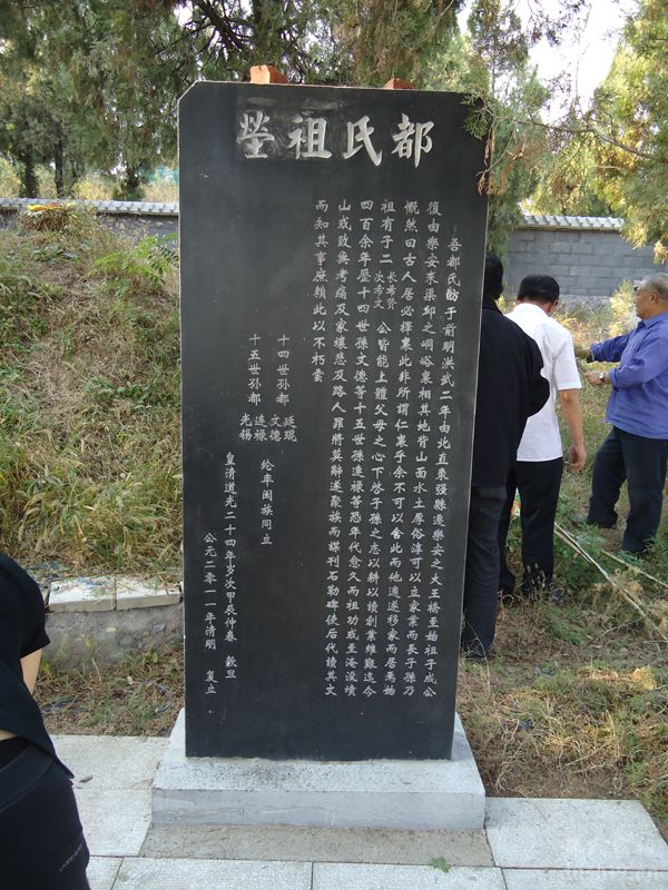 吾都氏昉于前明洪武二年,由北直枣强县迁乐安之大王桥,至始祖子成公,复由乐安来渠邱之峒峪里,相其地背山面水,土厚俗淳,可以立家业而长子孙,乃慨然曰:古人居必择里,此非所谓仁里乎,余不可以舍此而他适,遂移家而居焉。始祖有子二:长希贤、次希文公,皆能上体祖父之心,下啟子孙之志,以耕以读,创业维艰,迄今四百余年,历十四世孙文德等,十五世孙连棣等。恐年代愈久而祖功或致湮没坟山,或致无考,痛及家壤,悲及路人,罪将莫辞,遂聚族而谋,刊石勒碑,使后代读其文而知其事,庶赖此以不朽云。