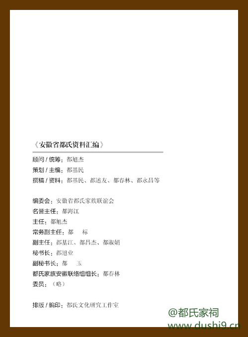 为组织召开安徽省都氏家族联谊会成立大会,自今年元月开始,安徽桐城都旭杰大哥组织开展了安徽省都氏资料的挖掘和整理工作,并亲自驾车到江西、河南等地进行实地探访,收集相关资料。日前,《安徽省都氏资料汇编》已由都氏文化研究工作室编印成册,共分专题综述、历史文献、相关研究、安徽省都氏家族历史事件追踪和安徽省都氏家族活动大事记等。将在安徽省都氏家族联谊会成立大会上赠送给大家。