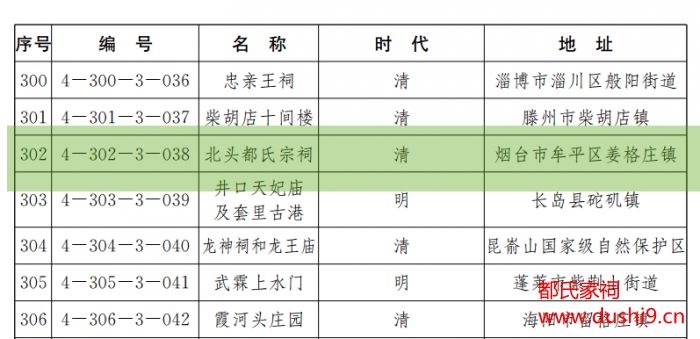 2013年10月10日,山东省人民政府(鲁政字〔2013〕204号)下发《关于公布第四批省级文物保护单位的通知》,将历史价值高、保存状况好,具有代表性的重要文化遗产列入其中。北头都氏宗祠被列为山东省第四批省级文物保护单位。