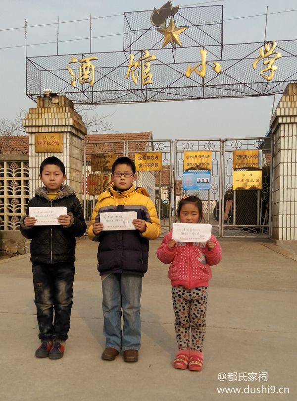 浙江省海宁市都林松宗亲得知山东牟平都氏祖居地都家子弟贫困生情况后,确定帮扶酒馆小学和酒馆幼儿园的都业祥、都茂林、都萍萍等3名都家子弟的贫困生完成学业。