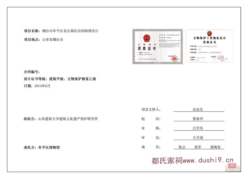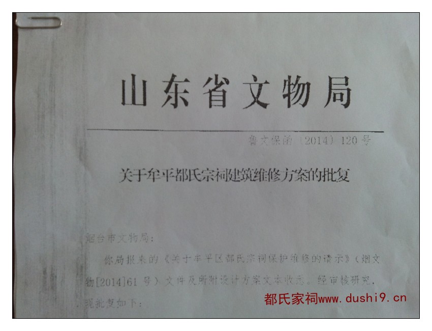 由山东建筑大学建筑文化遗产保护研究所承担的北头都氏宗祠修缮设计方案经专家论证后,近日由山东省文物局以鲁文保函【2014】120文件的形式予以批复,标志着北头都氏家祠建筑维修方案已正式确定。