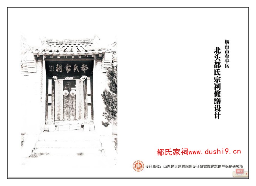 北头都氏宗祠作为山东省文物保护单位,其修缮建设工作需严格的规范和程序,修缮勘验设计和修缮施工必须由具有一定资质的单位完成。为此,烟台都氏家族理事会在国家文化部和山东省文物局等部门协调下,委托山东建筑大学建筑文化遗产保护研究所组织有关力量对都氏宗祠的现状进行实地勘测,历时三个月完成了修缮方案的设计工作。该方案依据文物保护相关法规,坚持“保持原貌、彻底修复”的原则,从根本上消除建筑文物本体安全的各种隐患,恢复宗祠的原有面貌。