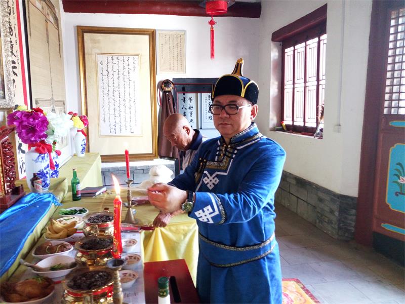 作为都氏后人,都本伟先生对都氏祖先十分敬仰和敬重。早在2007年第一次来都氏家祠时就欣然写下留言:春回北头,参拜先祖,承继伟业,再辟新途。并由同行的著名书画大师都本基先生用书法形式表现出来,至今悬挂在都氏家祠。本次祭祖活动,都本伟先生身着蒙族服装,以传统的礼仪,分别向家祠中供奉的圣祖成吉思汗铜像和都氏先祖必里海画像,进香、敬酒、三叩首,表达了自己的崇敬之意。