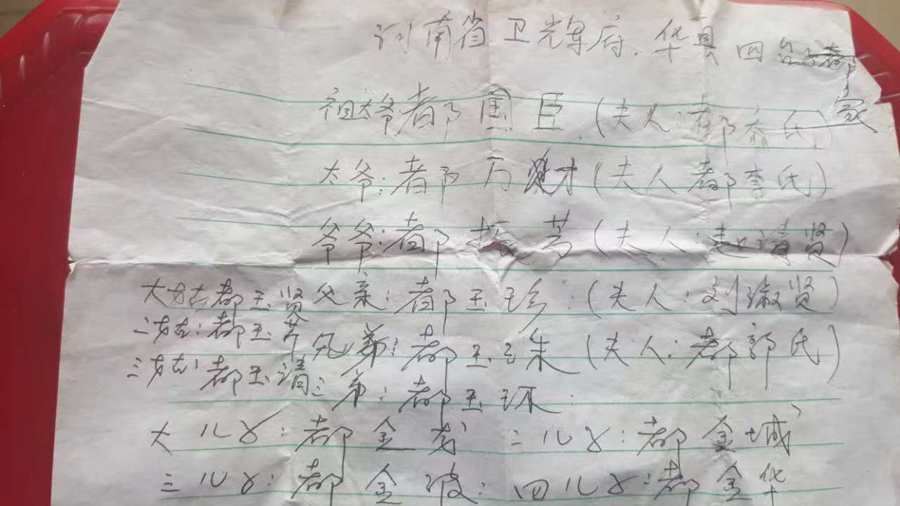 在浏览一个微信群时,其它都氏宗亲发了一照片,一张展示家庭成员的照片和详细写明了祖籍,源自河南省卫辉府华县四台子都家。这一信息立刻引起了我的注意,因为我觉得这与我所知的都家炉都氏有着同源关系。据我所知,现今在河南省安阳市滑县万古镇寺台村。