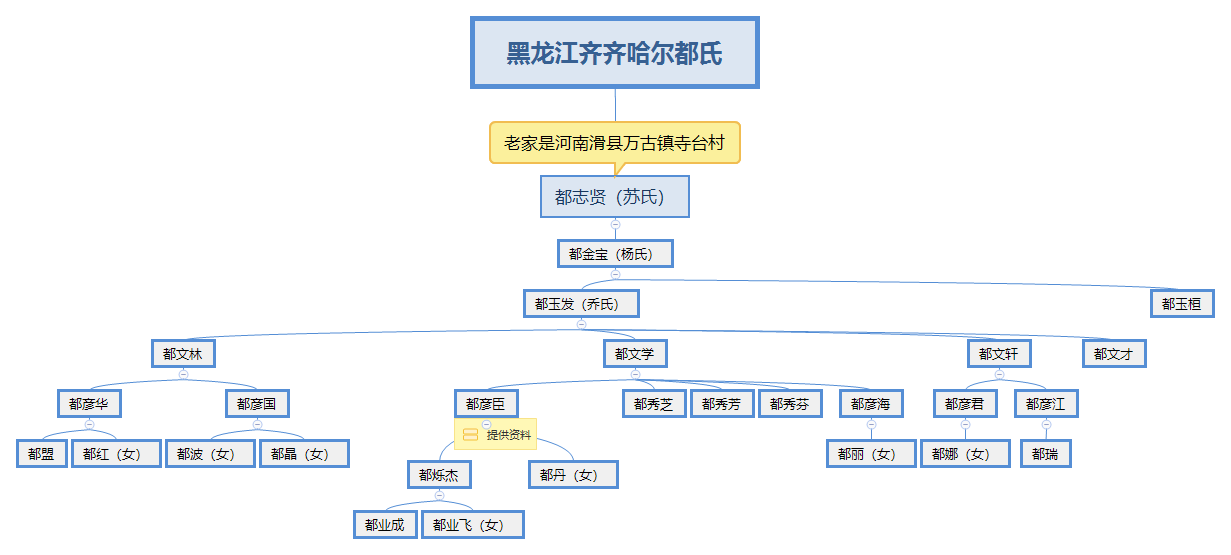 2023年3月16日,黑龙江齐齐哈尔的都彦臣通过都氏宗亲的介绍,添加了都百顺的微信,并分享了他家族的历史与寻根之路的困惑。都彦臣提到,他原本以为家族的祖籍在山东,但大伯父在爷爷去世时告诉他,家族的祖籍其实是河南滑县万古镇寺台村。他的家族世系是:都志贤—都金宝—都玉发—都文林、文学、文宣—都彦臣。目前,这一支都氏族人居住在齐齐哈尔,但对何时从寺台村迁出以及属于哪一世系,都知之甚少。