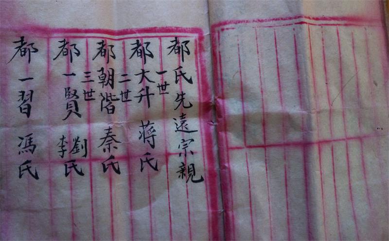 这份都氏家谱,内容简单,没有序言,没有年代记录,关于都氏世系的记录也比较模糊。但从纸质和外观来看,这份家谱形成的时间比较早,其中关于都氏先祖名讳的记载,打破了我们之前的认知。这份家谱记录,一世祖都大升,二世祖都朝阶,三世祖记有“应国、应邦”的名讳,四世祖记有“学礼、学文”的名讳,五世祖记有“自龙、自文、自孝、自法、自忠、自臣、自明、自伟”等名讳,六世祖有“信、福、杰、训、其、仁、开”等名讳,七世祖有“成林、成法、成永、成立、成凤、成大、成仁”等名讳。八世祖记录三人,思功、思成、思敬。